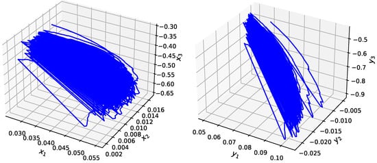 with and . and . As a result, system (35) has a chaotic attractor with initial condition , , , , and , as shown in Figure 4.