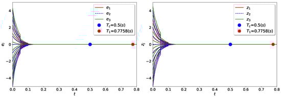 where , for are provided in system (33). It is not difficult to check that , , , , for . By choosing PDT as , then the Assumption 1, Assumption 2 and condition in Theorem 1 are satisfied with , , , , and . Therefore, according to Theorem 1, the drive–response systems (33) and (34) have a synchronized within PDT which is less than and under controller (7), where is the ST estimation for FXT synchronization, as provided in Equation (6). The results are shown in Figure 3.