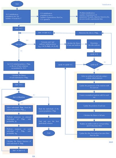 According to the literature review, a comprehensive hybridization between the ALO and GA has not yet been applied. Moreover, the ALO, neither modified nor hybridized, has been implemented for the parameter identification of cultivation process models.