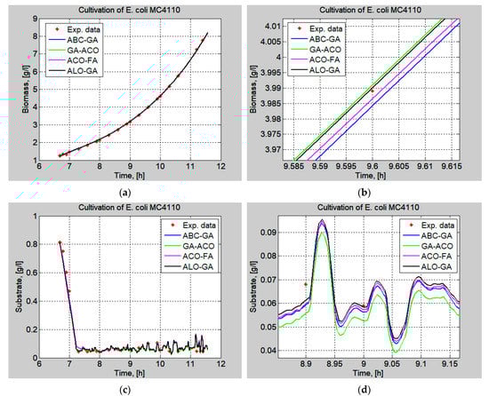 The predictions for the E. coli fed-batch cultivation process variables (biomass and substrate) acquired by exploiting the estimated model parameters in Table 6 are represented graphically in Figure 4. They are examined in contrast to the measured real experimental data. The obtained results are compared to the results of ABC-GA, GA-ACO, and ACO-FA.