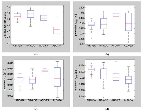 Box plot for the results from the parameter identification of an E. coli cultivation model: (a) objective function J; (b) parameter ; (c) parameter ; and (d) parameter .