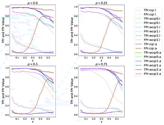 Case . Comparison of TPr and FPr for four levels of . In each subplot, the Y axis reports the TPr and FPr values at different . The solid line is TPr and the dashed line is FPr. Four colors are used to represent the methods: red for wcqr, green for wcqr0, blue for wcqr1, and purple for wcqr2. Light colors represent the LASSO penalty and dark colors are the ALASSO penalty for all methods.