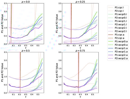Case . Comparison of P1 and P2 for four levels of . In each subplot, the Y axis reports the P1 and P2 values at different . The solid line is P1 and the dashed line is P2. Four colors are used to represent the methods: red for cqr, green for wcqr0, blue for wcqr1, and purple for wcqr2. Light colors represent the LASSO penalty and dark colors are the ALASSO penalty for all methods.