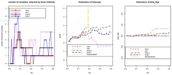 Figure 3, Figure 4 and Figure 5 report the numbers of selected variables as well as coefficient estimates by our weighted estimators compared with penalized quantile estimating equations proposed by [8] and the penalty-free methods with ranging from 0 to .
