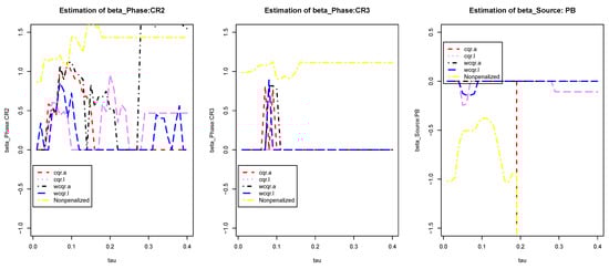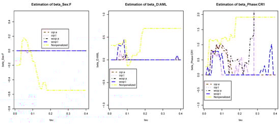 From the figure we can see mainly our estimators select similar numbers of variables to cqr estimators at lower quantiles, but in higher quantiles, the wcqr estimators lie between the cqr-LASSO and cqr-ALASSO. For the intercept, in lower quantiles, five estimators appears conincident with one another, although cqr-ALASSO estimators tend to be unstable, whereas wcqr estimators shows stability here. For age, all estimators regard this variable as unimportant, except that the two LASSO estimators probably overestimate the importance. For sex:F, almost all estimators shrink the corresponding coefficients to zero. The ALASSO estimators tend to treat D:AML as an unimportant variable, except for quantiles around 0.1. For phase:CR1 and phase:CR2, all estimators tend to select them in lower quantiles, but wcqr tends to select phase:CR1 at higher quantiles larger than 0.21 but neglects phase:CR2 from 0.22 to 0.27. For phase:CR3, all the estimators show analogue performances but with slight shifts. For source:PB, the wcqr estimators perform more stably than cqr for all quantiles. The estimations for based on the five methods are placed in Figure 6.