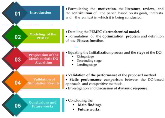 As shown in Figure 1, the proposed work design steps and flowchart are illustrated. Section 2 describes the mathematical modeling and the PEMFC; Section 3 formulates the investigated issue as an optimization problem; Section 4 discusses and analyses the main steps of the DO-based PEMFC parameter estimation; Section 5 is devoted to the validation of the DO, the discussions, and the comparative study with six well-known metaheuristic algorithms. Finally, the conclusions and future works are involved in Section 6.