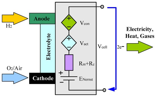 According to the literature, there are several types of models used to estimate the voltage–current relationship of the PEMFC. Amphlett’s semi-empirical model is the most widely used thanks to its simplicity and efficiency [36,37]. In fact, this model presents the output voltage of a fuel cell as the sum of the thermodynamic Nernst voltage, the activation polarization, the concentration polarization, and the ohmic polarization (see Figure 2). Thus, the output voltage of the fuel cell can be written as Equation (1):