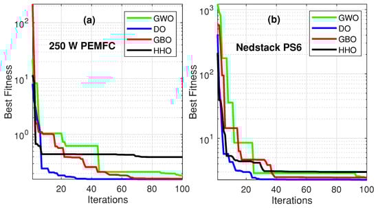 The fitness function convergence curves of the different algorithms are shown for the two PEMFCs in Figure 3. In this figure, the convergence curve of the proposed DO algorithm reveals that it is much faster than the other three algorithms for the two investigated stacks. In both examples, the DO algorithm is computationally efficient, as it converges after a small number of iterations (27 iterations).
