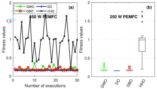 The statistical study of the 250 W after 30 repetitions: (a) best values of the objective function; (b) boxplot of SSE.