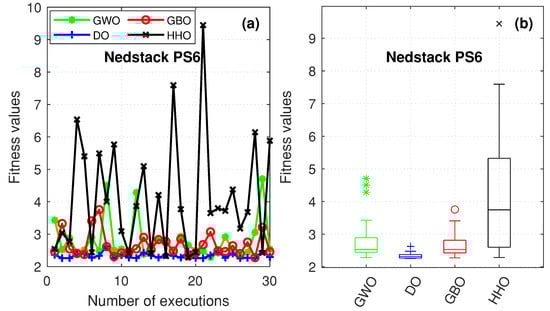 In order to evaluate the stability of the different algorithms, the boxplots, for the SSE after 30 repetitions of 100 iterations, are plotted in Figure 4 and Figure 5. The interquartile ranges increase as one moves from the DO algorithm to the GBO algorithm and then GWO and HHO. The distribution of outcomes (SSE) built by the DO algorithm is around its median. Based on these comparisons, it can be concluded that the proposed DO algorithm achieves better performance in terms of accuracy and robustness compared to the other algorithms.