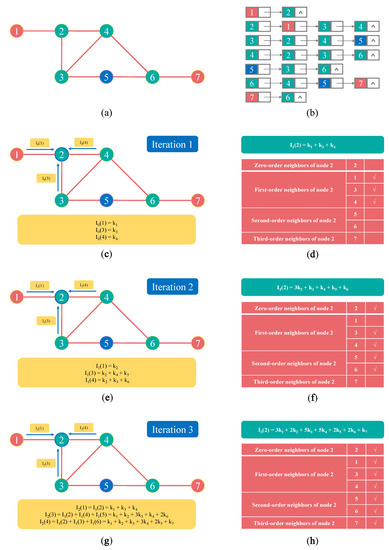 In iteration 2, each node collects the first-order information of its directly connected neighbors and update the information of itself, so the second-order information of node i, denoted by , can be defined as the following Equation (20):