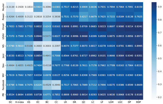 As shown in Figure 2, the effective local-information-based algorithms (LR, DR, QC, LC, LF, LGM, LGC, DP and RDP) perform better than the classic algorithms (DC, H-index, KS, EC, BC and CC). Although EC performs well on some networks (especially in USAir and WV), it performs extremely poorly in these two networks (Power and NS). Furthermore, for the local-information-based algorithms, RDP generally performs better than the other algorithms. In ten real-world networks, RDP gets six best results (Email, NS, Jazz, WV, Facebook and PB), DR gets two best results (Router, USAir), and LGC gets two best results (Power and Sex). Considering that the complexity of these two algorithms is relatively high in local-information-based algorithms, while our method has the lowest complexity, which suggests that our method has both accuracy and efficiency. Furthermore, as shown in Figure 3, DP and RDP still perform very competitively compared with 13 benchmark algorithms for different values, which suggests the robustness of our findings.