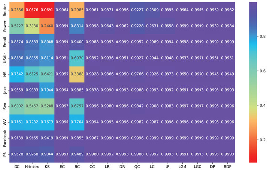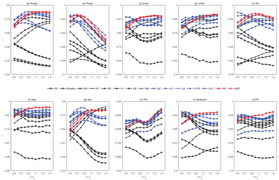 Furthermore, 13 benchmark algorithms are selected in our experiments, respectively are: degree centrality (DC), H-index [23], k-shell decomposition method [24] (KS), eigenvector centrality [25] (EC), betweenness centrality [26] (BC), closeness centrality [27] (CC), LocalRank (LR) [28], DynamicRank (DR) [29], local gravity model (LGM) [30], Quasi-Laplacian centrality (QC) [31], the third Laplacian energy centrality (LC) [32], Laplacian gravity centrality (LGC) [33] and Local-Forest (LF) [35]. Figure 2 shows the accuracies of DP/RDP and 13 benchmark algorithms for . The T of DP and RDP is set to 3. The R of LGM and LGC is set to . The of DR is set to . Further, Figure 3 shows the accuracies of different values which are not too far from .