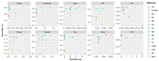 Figure 4 shows the runtime and accuracy of different algorithms in the ten real-world networks. The closer the point corresponding to the algorithm is to the upper left corner, the higher the accuracy and the shorter the runtime of the algorithm. It is obvious that DP and RDP perform very well.