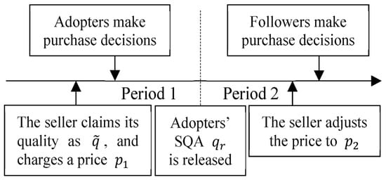 At the beginning of the second period, since purchased adopters released their SQA on the product, the seller adjusts the price to according to the released SQA in pursue of a higher profit. Next, after observing the quality claim and the released SQA , followers’ quality expectations vary by type. Naive followers take as their quality expectation, that is, ; whereas experienced followers can infer the quality information via backward induction based on three rationales: one, if , they can backwardly infer the genuine quality as ; two, if , they infer that there exists a unique quality point below which the seller will be better off inducing ; three, if , they infer that there exists a unique quality point above which the seller will be better off inducing . The explicit backward induction process and the expression of experienced followers’ quality expectation in each scenario are presented in the Supplementary Materials. Then, followers make purchase decisions accordingly, and the seller’s profit is realized. The timing of this game is illustrated in Figure 1.