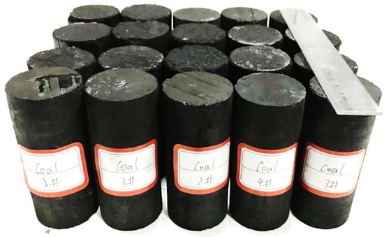 For this research, samples were collected from the working face of a coal mine in the Shanxi province of China. Samples were prepared per the international rock mechanics standard and then used in laboratory experiments. The samples were drilled, wrapped in bubble film, and then delivered to the laboratory. Cylindrical-shaped samples with a 50 mm diameter and 100 mm height are shown in Figure 1. A total of 9 samples were collected from a total of twenty samples based on their batch and average density and divided into three groups: D, N, and S, of which the D and S groups were immersed in deionized water. These groups represented dry, natural saturated, and saturated samples, respectively. The samples were soaked in water for 24 h to achieve full saturation. During the drying process, samples from the D group were placed in an oven at 60 degrees Celsius for 24 h. The test results are summarized in Table 1.