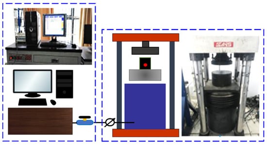 The loading system is illustrated in Figure 3. This system comprised several uniaxial compression tests with (1) uniform loading, (2) cyclic loading, and (3) dynamic state. A 3000 kN pressure testing equipment (Y4306) was used for the loading system []. The system included a press host, a loading control system, a computer, and a power-test V33 control composition. During the experiment, the pressure head of the press produced pressure and displacement, which were transmitted with analog electrical signals to the loading control system via the pressure sensor and extensometer. Digital signals from the control system were transmitted to the computer, where the data signals were collected and stored by the software. The power-test V33 software drove the press via the control box to complete the loading operation in accordance with the manual instruction. Force and displacement data were sampled at up to a rate of 100 Hz. The experimental curves were recorded and displayed in real-time based on load time, deformation time, force deformation, and force displacement.
