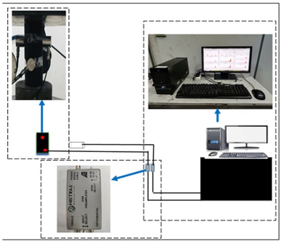 The AE System (PCI-2), shown in Figure 4, was used to record the data. This system includes a digital-to-analog converter module with an A/D conversion rate of 18 bits, eight digital input/output channels, and two real-time data acquisition channels. Before the conversion module obtained the signal, the preamplifier amplified it. The amplifier provided three output levels: 20 dB, 40 dB, and 60 dB. AE sensors were equipped with a 20 dB electronic preamplifier that could respond to frequencies between 50 and 400 kHz.