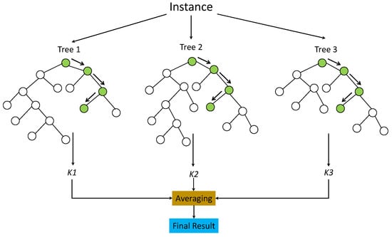 RFR makes predictions based on bagging the data, which serves as the foundation of this technique. Decorrelated decision trees (DTs) are formed by joining samples collected via the bagging method with samples collected using other methods. The results of averaging all DTs are used to improve the modeling quality without resorting to overfitting. Figure 5 illustrates the general architecture of RF. This figure represents the results of the individual DT as indicated by numbers k1, k2, etc., up to and including kn.