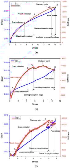 The crack closure, crack initiation, and dilatancy stresses were calculated from the stress–strain and stiffness–stress curves for the three batches of coal [,]. The test results are shown in Figure 6a–c, which illustrates the stiffness–stress and strain–stress curves under uniaxial loading. A point known as the crack closure (point A) was reached during the loading phase when both curves tended to converge. This curve climbed with loading until it reached the point of crack initiation (point B), where it reached its maximum curvature. Elastic deformation occurred at stage AB. In the stiffness curve, the slope rose progressively until point C, also known as the dilatancy point, which corresponded to the dilatancy stress. The fracture propagated continuously in segment BC. The curve gradually reached the maximum stress point D as loading increased, with the segment CD representing the propagation of unstable fractures. As a result, the rock sample produced audible sounds. The fractures rapidly widen, spread, and join together to form macro fracture surfaces, but the rock sample remains relatively undisturbed.