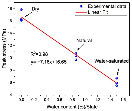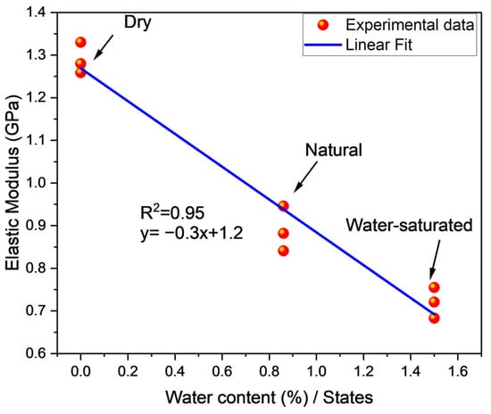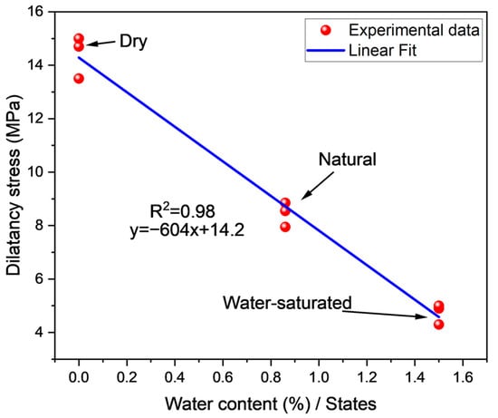 Figure 7, Figure 8, Figure 9 and Figure 10 show the relationship between elastic modulus, peak stress, crack initiation stress, and dilatancy stress as a function of water content. Figure 7 depicts a negative linear correlation between elastic modulus and water content. It is concluded from Figure 7 that the elastic modulus declined with the increase in water content, as revealed in Table 1. In the case of peak stress and water content relation, a linear negative relation is shown in Figure 8. From Table 1, the peak stress of the dry sample was less than the natural sample but greater than the saturated sample. It can be observed in Figure 9 that the crack initiation of natural coal was 4.3 MPa, less than the dry sample’s initial crack stress of 5.2 MPa, but greater than the saturated coal sample, which was 2.80 MPa. The dilatancy point of the dry sample was approximately double that of natural coal while three times greater than saturated coal, as itemized in Table 1 and indicated in Figure 10. The water plays as a lubricating agent, resulting increase in the reduction in the rate of stress increase. Water reduces stress and increases the effect of weakening through its lubricating properties []. The rock encounters dissipative and elastic strain energy during loading. Assuming that the rock does not lose heat during the loading, the total strain can be calculated using the first law of thermodynamics.