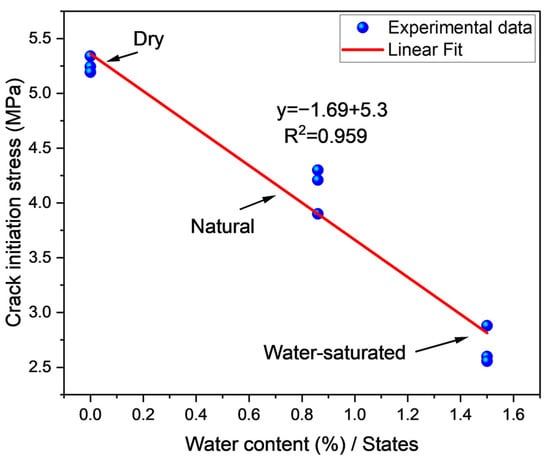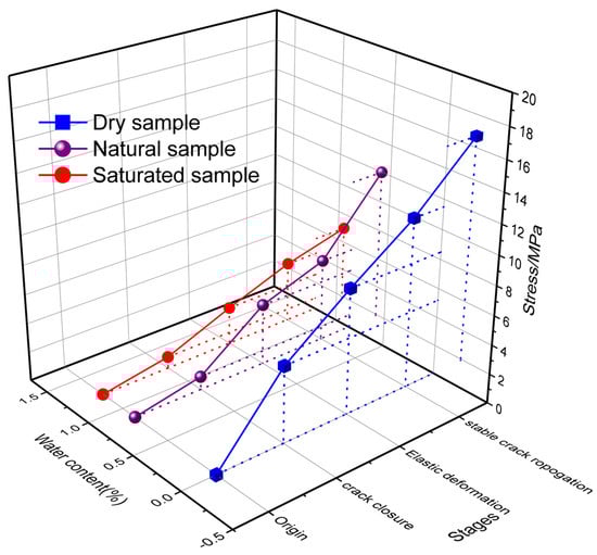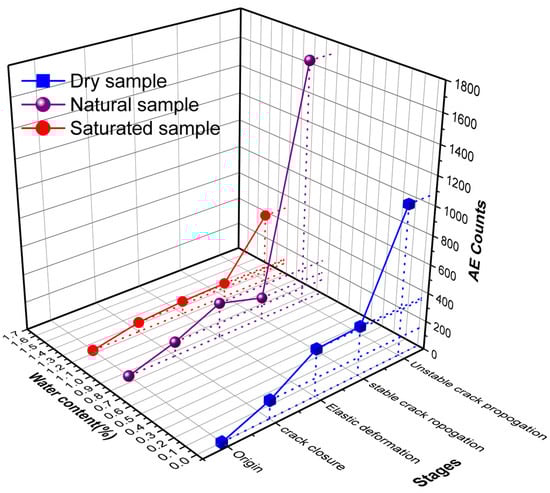 Figure 13d illustrates the impact of water on coal cumulative counts. It shows that the cumulative counts of the coal sample reduced with the water content. In different water content, the AE counts and corresponding stress stages are shown in Figure 13. With water, stresses at dilatancy and crack initiation point decreased while the rate of AE counts increased, as shown in Figure 14. According to the literature [], water is effective in decreasing stress, and the stress at crack initiation and damage have an inverse relationship with water content, and a negative linear relationship exists of water with corresponding AE counts at both crack initiation and damage. This behavior is due to water lubrication, which affects the crack initiation and the cracking. With increased water content, the rate of crack initiation stress decreased and crack damage stress increased, as shown in Figure 13. These experimental results were in line with the literature [].