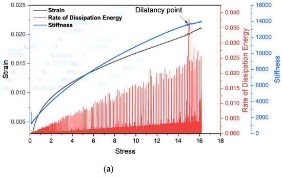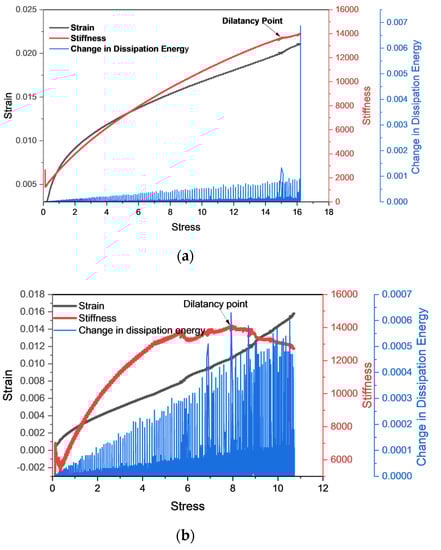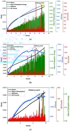 It can be observed from Figure 14 that the AE counts and rate of change in dissipation energy corresponded well with the change in stress. However, at the dilatancy point, the variation in the behavior of the AE counts and the rate of change in dissipation energy was quite similar. It provided a basic correlation between AE count and the rate of change in dissipation energy. At the dilatancy point, the AE counts and rate of dissipation energy showed a rise with the decrease in stress and followed the sample pattern. However, with the increase in water content, the dilatancy stress decreased and vice versa (Figure 15 and Figure 16).