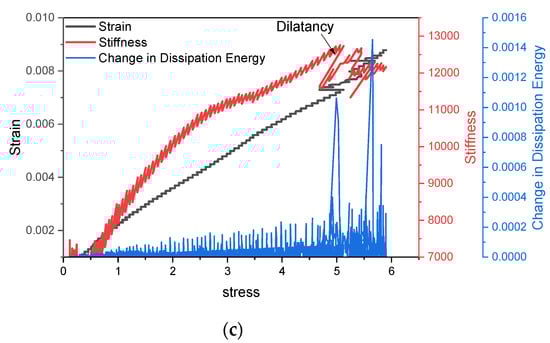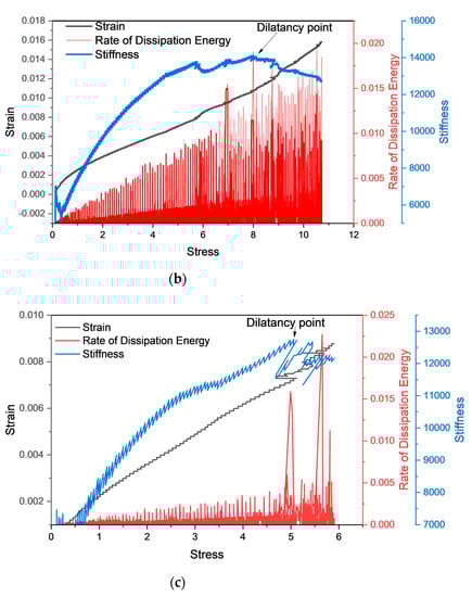 Illustration relation of strain, stiffness, and rate of dissipation energy over the stress of (a) dry sample, (b) natural sample, (c) saturated sample.