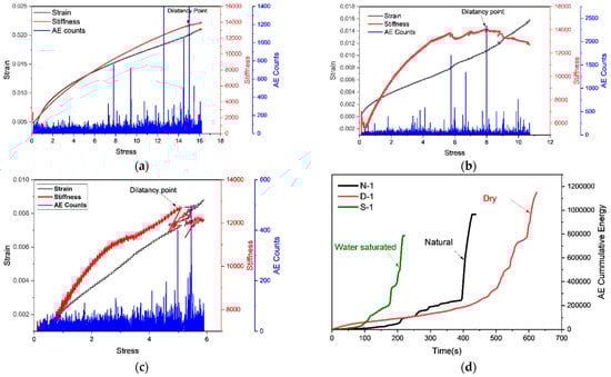 The relation of strain, stiffness, and AE counts with stress (a) dry sample, (b) natural sample, (c) saturated sample and (d) relation of time and AE cumulative counts.