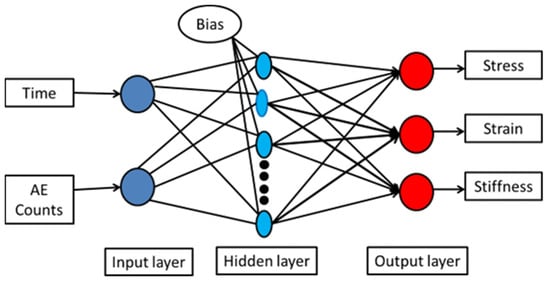 The parameters in this study were time, AE counts, stress, strain, and stiffness. Prediction of the remaining parameters was based on the input parameters, AE counts, and time. Table 2 shows the analysis results for different water contents. The input parameters in the model were systematically explained and elaborated in the literature [,,]. Three groups of samples based on water content were focused on in the study in computation. Each condition in computation held more than eight thousand data points. The three groups’ data points were compiled into a single data set. Figure 17 shows the flow chart of the whole ANN model process. MATLAB’s workspace has inputs and outputs defined according to the flowchart. Since the stress time and AE time on the stress–strain curve did not correspond, extrapolation and interpolation were performed to make AE and stress time correspond. The data were then split by training (70%) and testing (15%), and validation (15%) after true labeling of AE and stress time was achieved. A model was trained by means of a variety of neurons. A total of 100 neurons were assigned in the loop, and the RMSE and R2 were determined for each neuron and saved with the name network1 for neuron 1, and network2 for neuron 2, etc. As a result, the model with the highest R2 and lowest RMSE was selected as the best, and the neuron associated with that model was selected as the optimal neuron. The performance indices were calculated after selecting the best model in terms of optimal neurons.