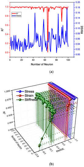 Based on the model, the predicted values can be replicated for all four conditions []. Training, testing, and authentication components/phases were examined in the data set. Phase distributions for these parts/networks were 75, 15, and 15 percent, respectively. In this study, the neural networks were trained using different neuron numbers for accounting for stiffness, stress, and strain. In Table 3, the ANN properties of 80 neurons were shown to yield the optimal regression model of these parameters. Stress–strain and stiffness are the optimal design parameters for the ANN model.