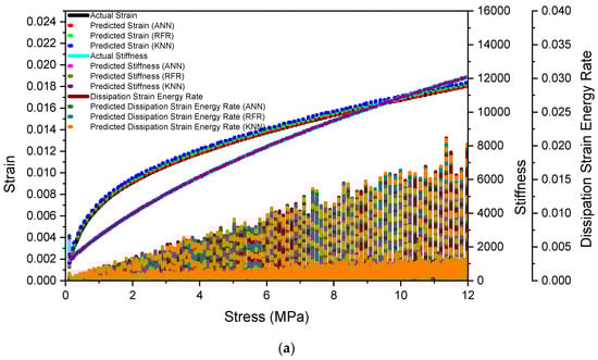 ANN model parameters stiffness, strain, and stress are shown in Table 3, indicating where networks were convergent. Efficiencies will be achieved in the convergence and implementation of networks. According to RMSE and R2, stiffness > strain > stress is the network’s rating. In addition to evaluating the model based on its rating, gradient analysis can also be used to assess its performance. The bigger the value, the greater the error between the actual value and the estimated value []. It is evident from Figure 19 that the model reduced its error level. We identified the optimal ANN models based on maximum R2 and minimum RMSE for all outputs, which used the optimal stiffness, stress, and strain, put together (0.00703, 0.998), (0.00890, 0.999), and (0.00703, 0.981), respectively. An ANN was used to predict the absolute strain energy rate of dissipation. The optimal RMSE and R2 based on ANN were 0.00703 and 0.999, respectively, as shown in Figure 19a,b.