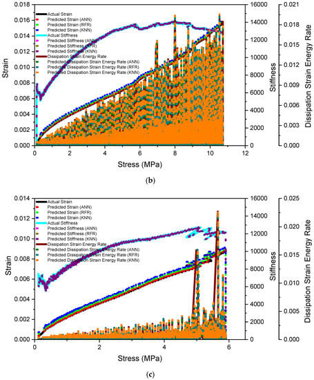 Evaluation of actual value and the predictive value using ANN of strain, stress, dissipated energy, and stiffness of (a) dry sample, (b) natural sample, (c) saturated sample.