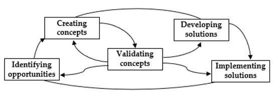 Section 8 of ISO 56002 focuses on the innovation process itself, proposing the following steps: identifying opportunities (8.3.2); creating concepts (8.3.3); validating concepts (8.3.4); developing solutions (8.3.5); and implementing solutions (8.3.6) [24]. It is important to emphasise that, in this standard, the innovation process is conceived in a non-linear manner, as illustrated in Figure 1.