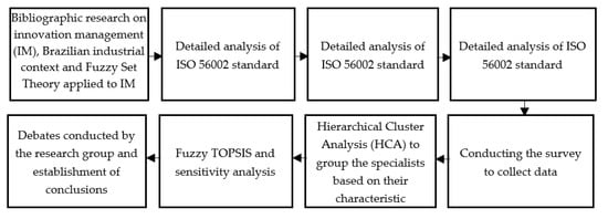 It is important to note that this study is part of a larger project whose main goal was to conduct exploratory research in three areas in the Brazilian industrial context: (i) business continuity management; (ii) innovation management; and (iii) competence management. Each study used as a framework the corresponding ISO standard, namely ISO 22301, ISO 56002 and ISO 10015, respectively. In all studies, data was collected via survey from specialists with extensive academic and professional experience in the specific area (i, ii or iii). Regarding the data analysis, all studies used an adapted version of Fuzzy TOPSIS (Technique for Order Preference by Similarity to Ideal Solution), in which specialists were used as criteria and their responses were weighted based on their level of knowledge and experience in the area, as well as Hierarchical Cluster Analysis (HCA) to group the specialists according to their characteristics, frequency analysis and sensitivity analysis. The first study of this macro-project was published in the Mathematics journal with the title, “Analysis of the Level of Adoption of Business Continuity Practices by Brazilian Industries: An Exploratory Study Using Fuzzy TOPSIS” [29]. It featured in a special edition called, “Advances in Fuzzy Logic and Artificial Neural Networks”. In the present paper, the study concerning innovation management is presented.