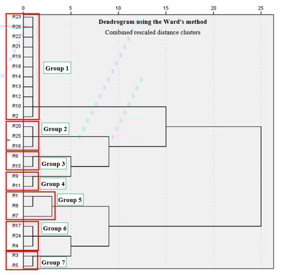The HCA allowed defining how the data are grouped according to the characteristics of the specialists, resulting in a hierarchy that can be represented by a dendrogram [67]. In this study, the HCA was applied to understand specialists’ similarities and group them according to their academic titles and professional experience in the innovation management field. These aspects were chosen for analysis because the researchers considered they were the most relevant to the purpose of allocating the specialists in levels of ability to express opinions about the topics under investigation. The HCA produced seven groups of specialists (see Section 4.1 for a detailed explanation).