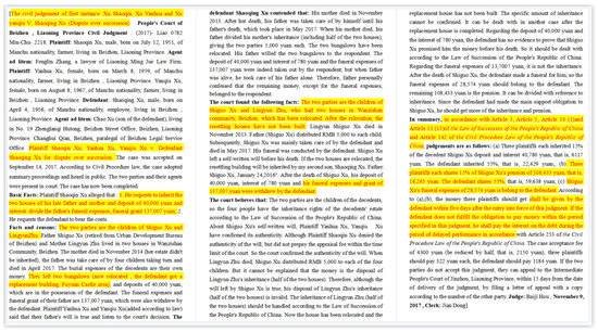 In the legal field, previous judgment documents are important references for legal practitioners to determine the measurements of the penalties and judgment scales. Legal practitioners must read through hundreds of judgment documents to identify precedents that conform to a specific case’s characteristics. Therefore, the automatic summarizations of legal judgments are very important. Saravanan et al. proposed legal-field-specific approaches to implement automatic summarization for legal judgment documents, to a certain extent [1,2]. However, the complex textual structure of a legal document is different from that of an academic paper. An academic paper typically has a conclusion section that summarizes the work, while a legal judgment’s conclusion may be scattered throughout the text. Figure 1 demonstrates how the key information was scattered throughout a specific case judgment document. Therefore, extracting key information from a lengthy text is crucial for the implementation of summarization automation on legal judgment documentation.