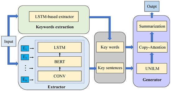 In addition, recent studies [21] have focused on summarization via pre-trained language models. Zhang et al. and Liu et al. [22,23] first applied BERT to fine-tune text summarizations. By using BERT’s word-embedding as input, Wang et al. [24] integrated extractive and generative networks into a unified model. This enabled the model to learn how to extract and generate information from the input text in an iterative and adaptive approach.