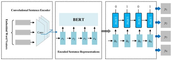 We employed a temporal convolutional model [25] to compute the representation of each individual sentence in the document, so that sentence coding could be realized quickly and simultaneously. BERT [26] was applied to the convolutional output to further capture the long-range semantic dependencies among sentences, and it ensured the context semantics. Moreover, it enabled a strong representation, denoted as , for the j-th sentence in the document to be learned, and therefore, the contexts of all previous and future sentences were considered in the same document.