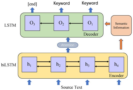 Legal judgment texts usually contain many keywords related to technical terms and specific topics, which are difficult to interpret. In order to integrate the keyword information into the summary, we added a keyword-extraction component to obtain the keywords. At present, the term frequency–inverse document frequency (TF-IDF) method [28] has been widely used to extract keywords. The TF-IDF method indicated that if a word frequently appeared in an article but rarely in other articles, we could assume that the word was important. Although TF-IDF was simple and efficient, it measured the importance of words only by frequency, without considering the word order or semantics. To overcome this problem, we introduced a BiLSTM and an attention mechanism because the BiLSTM could learn contextual semantic information well, and the attention mechanism could identify the relevant information in the full text. In this study, we used a seq2seq network [29] to perform keyword-extraction tasks. An overview of the model is shown in Figure 4. Specifically, the BiLSTM encoded the input sequence into a hidden layer state , respectively, where is the i-th input token and represent the i-th hidden state. Then, the hidden state sequence could be updated by the attention mechanism and introduced to the decoder LSTM to generate an output sequence , respectively. The variable is the generated keyword at t time, and it is according to the at the t−1 time, the current hidden state , and the context vector , as shown below: