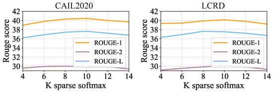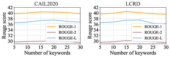 In this subsection, we investigate how different hyper-parameters affected the proposed framework. Figure 6 shows the results when we selected the hyper-parameter of sparse softmax, as this model obtained the best performance on the CAIL2020 and LCRD datasets. At the same time, Figure 7 shows that the number of keywords that also had an impact on the final performance. For the CAIL2020 dataset, the model performed best when the number of keywords was 15. For the LCRD dataset, when the number of keywords was between 15 and 20, the model achieved the best performance.