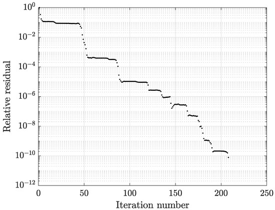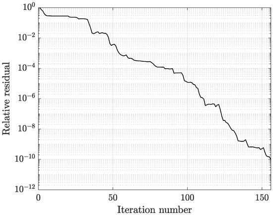 Concerning the FEM solution, the number of TFQMR iterations to attain the solver prescribed tolerance of was almost doubled compared to the CM-BEM: for the coarsest case, the solver converged into 372 iterations instead of 208 of the CM-BEM. Figure 20 shows the convergence pattern of the TFQMR + SSOR solver for the FEM, which corresponds to Figure 9 evaluated for the same solver when running the CM-BEM model.