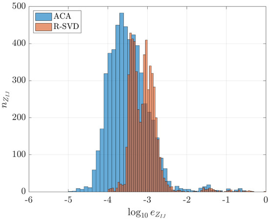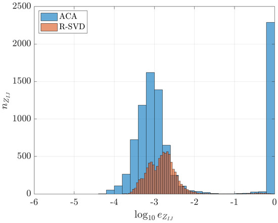 is less than a prescribed approximation tolerance . It has to be noted, however, that (54) cannot be explicitly calculated due to the high computational cost of ; therefore, an error estimate is used instead (see [25] for details). This estimate is based on the assumption of an asymptotically smooth integral kernel, which holds for the single-layer matrix [26]. For other types of integral kernels, the convergence of ACA is not theoretically guaranteed and can only be investigated with the help of numerical experiments.