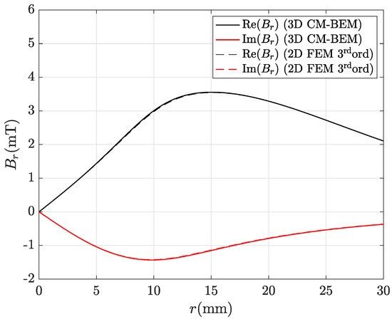 Real and imaginary parts of the magnetic flux density radial component along line AB depicted in Figure 8 computed by the hybrid method (R-SVD matrix compression) with the coarsest mesh (69,492 tets): CM-BEM is the straight line, second ord. 3D FEM (reference) is the dashed line.