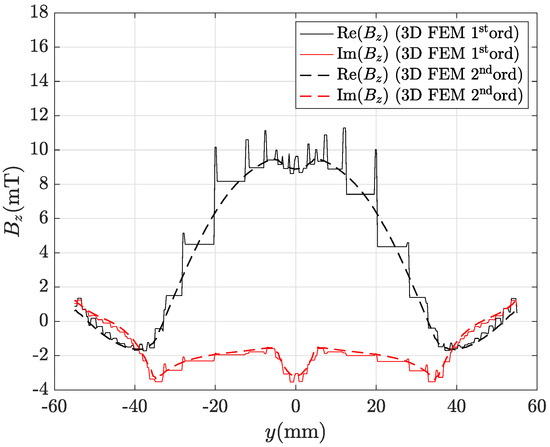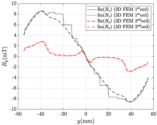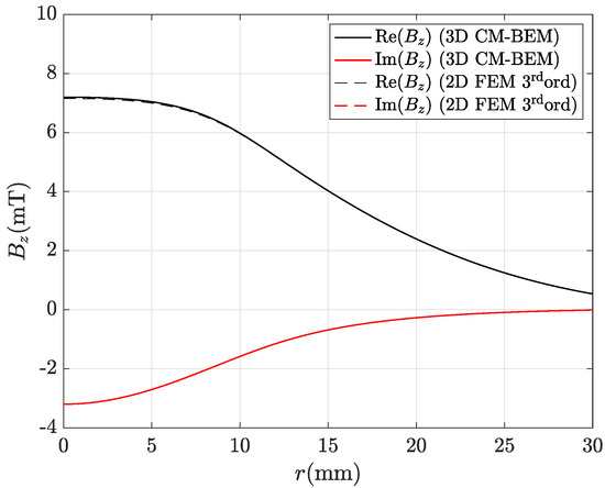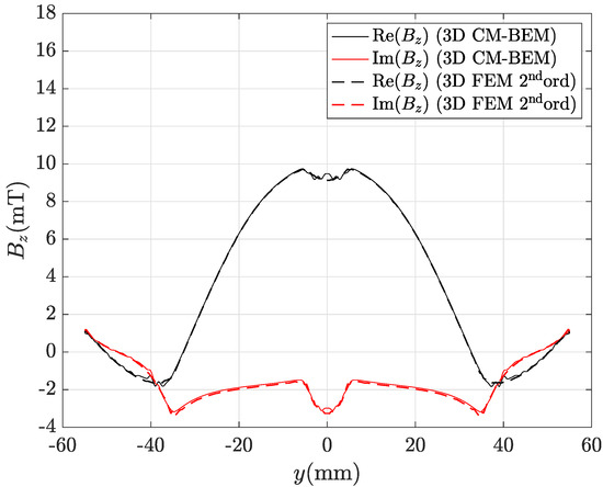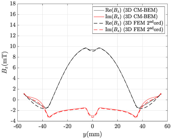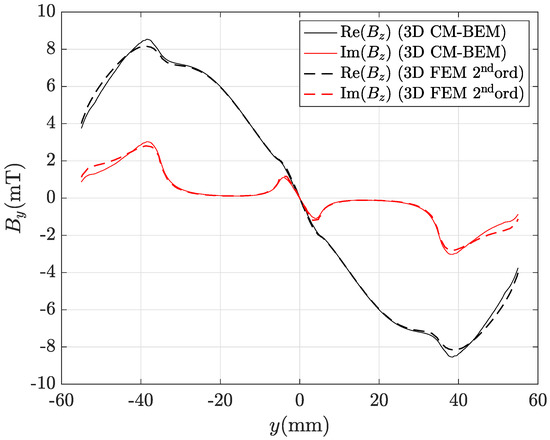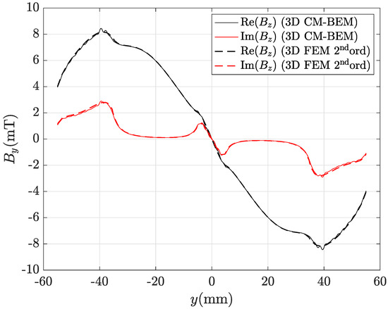 Real and imaginary parts of the magnetic flux density radial component along line AB depicted in Figure 8 computed by the hybrid method (ACA matrix compression) with the finest mesh (435,213 tets): CM-BEM is the straight line, second ord. 3D FEM (reference) is the dashed line.