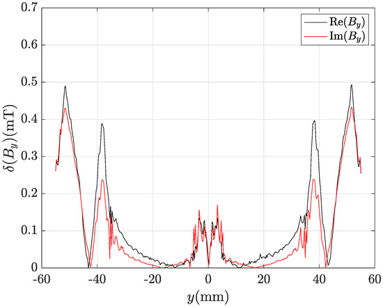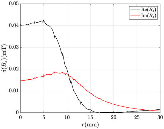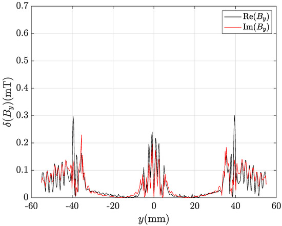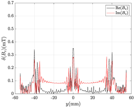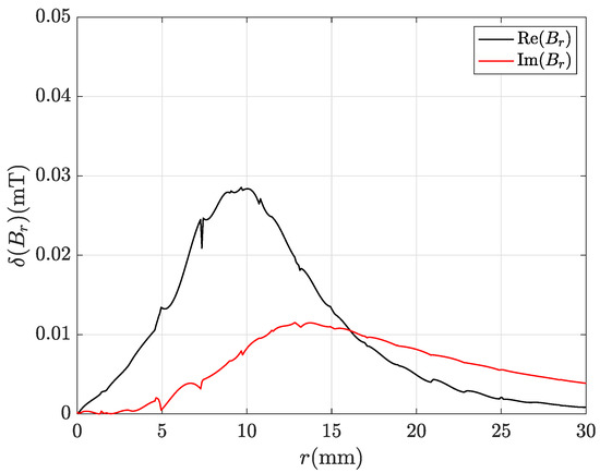 Even by using the finest mesh refinement (435,213 tetrahedra), the CM-BEM with ACA matrix compression provides incorrect results as can be observed from profiles of , real and imaginary parts shown in Figure 15 and Figure 16. Figure 17 and Figure 18 show the corresponding local discrepancy profiles. In particular, it can be noted that around mm is almost doubled compared to the corresponding plots for CM-BEM with R-SVD (Figure 13 and Figure 14). The discrepancies computed by (56) are: , for component; , for component. These values are much higher than those shown above for CM-BEM with R-SVD.