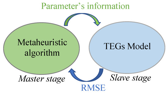 For solving the problem of material property characterization and parameter estimation of a thermoelectric generator, in this paper, a master–slave strategy composed by three continuous metaheristic optimization methods (VSA, CGA, and CSA) in the master stage was proposed, which was responsible for identifying the configuration of parameters that achieve the minor RMSE, characterizing, in this way, all components of the mathematical model that represent the thermoelectric generator in the analysis, as well as for estimating the power generate to different temperatures. In the slave stage, a non-linear and non-convex formulation is entrusted with evaluating the RMSE and satisfying the limitations associated with the problem’s parameters. Figure 1 illustrates the master–slave methdology used.