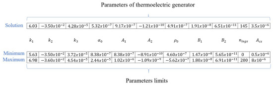 For generating each one of the possible solutions proposed by the optimization methods previously mentioned, in this work, the codification presented in Figure 2 was proposed. In this figure, a possible solution to the problem is presented; this solution used the codification proposed, which is composed of a vector of size 1 × 11, where the number of columns corresponding to the eleven variables was proposed to parametrize the power behavior of the thermal generator when it operates at different temperatures. The parameters in the mathematical model of a TEG module are composed of polynomial coefficients of material properties and geometrical parameters. The first nine parameters correspond to the polynomial coefficients, with , and representing the coefficients of thermal conductivity, , , and representing the coefficients of the Seebeck coefficient, and , , and related to electric resistivity. The 10th parameter is the equivalent number of legs of the TEG module, and the last parameter is the effective cross-sectional area of a single TE leg. The example proposed presents in an aleatory way values between the maximum and minimum limits established through the datasheet reported for the thermal generator described in Section 3, which are presented inside the figure aforementioned. The optimization methods used in the master stage employ this codification for generating the different individuals that compose the populations used in the iterative process.