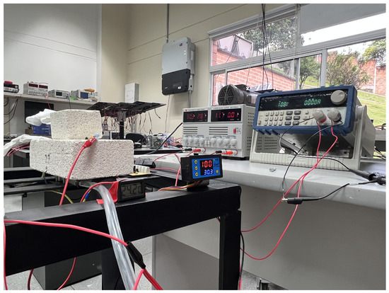 As a test scenario, a current sweep is performed on a thermoelectric module (TEG1-12611-6.0), manufactured by TECTEG MFR [52]. The module is tested under different temperature differences between the cold and hot sides of the TEG module. The experimental equipment is presented in Figure 3. The TEG performance is measured through the utilization of various instrumentation devices. These devices, which form the instrumentation component, comprise an oscilloscope, a multimeter, and thermocouples. Additionally, auxiliary control electronics are integrated into the experimental setup to regulate the temperature of the heat source and heat sink, in order to automate the measurement process.