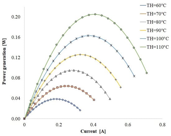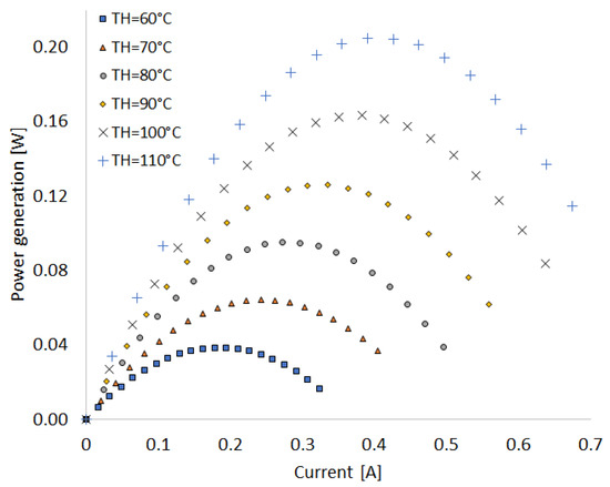 The low-temperature surface of the cell is cooled by a heat exchanger, through which ambient temperature water ( = 24.3 C) circulates; the high-temperature side is heated using an electric resistance powered by a source and controlled by an automatic self-tuning controller. Current sweeps are performed, and the output voltage and current are measured using an oscilloscope, allowing for the calculation of the cell’s output power. This test is conducted for six different high-temperature conditions ( = 60 C, 70 C, 80 C, 90 C, 100 C, and 110 C). This test scenario is repeated experimentally 10 times, and the averaged curves for each hot-side temperature are shown in Figure 4.